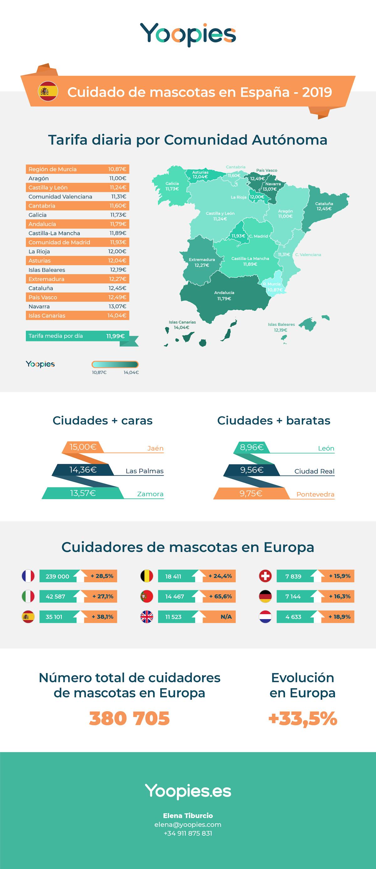 Este año, los servicios de cuidado de mascotas a domicilio están más en auge que nunca y se convierten en la solución perfecta para sus dueños. En un momento en el que cada vez hay más animales de compañía en las ciudades españolas, la plataforma Yoopies España ofrece una gran variedad de cuidadores de mascotas a precios económicos: las tarifas se sitúan en una media de 11,99 €/día. No obstante, este último año el coste ha aumentado en la mayoría de Comunidades Autónomas españolas, situando a España por encima de otros países europeos como Francia (11,70 €/día) e Italia (10,89€/día) y siendo solo superada por Portugal, con una media de 12,87 €/día.