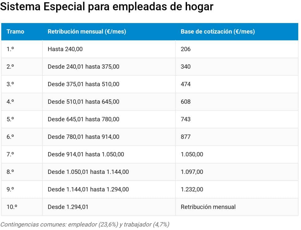 Así, a cada tramo de salario le corresponde una base de cotización sobre la que se aplica el tipo de cotización correspondiente al empleador. Sobre la cifra resultante y durante los años 2012, 2013, 2014, 2015, 2016, 2017 (con una suspensión del descuento desde julio a septiembre), 2018 y 2019 se ha aplicado una rebaja del 20% (el 45% si el empleador es titular de familia numerosa). Esa rebaja no se aplica a los empleadores que ya cotizaban por el mismo empleado entre agosto y diciembre de 2011, ni a los que han pactado con su empleado que sea él mismo quien se ocupe de ingresar las cotizaciones (algo posible para empleados que trabajan menos de 60 horas al mes por hogar). Por ello, mientras duren las bonificaciones es mejor que el empleador se ocupe del ingreso de las cuotas.